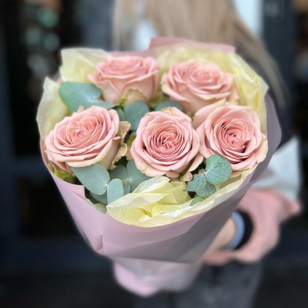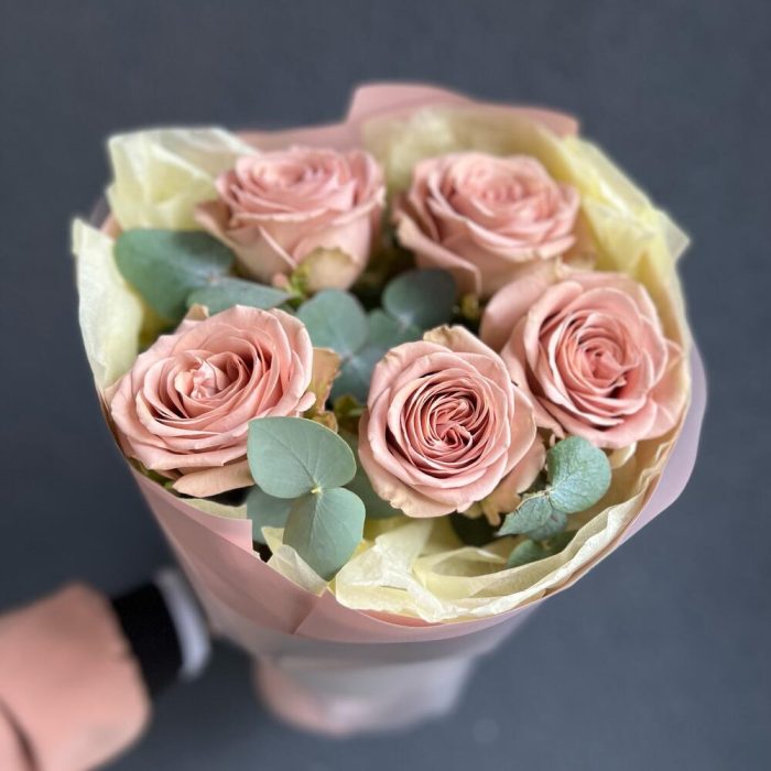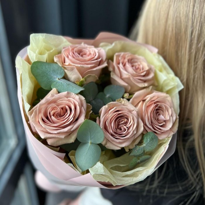 Роза мокко – 5 шт.Эвкалипт – 4 шт.Упаковка дизайнерская – 1 шт.Лента атласная – 1 шт.