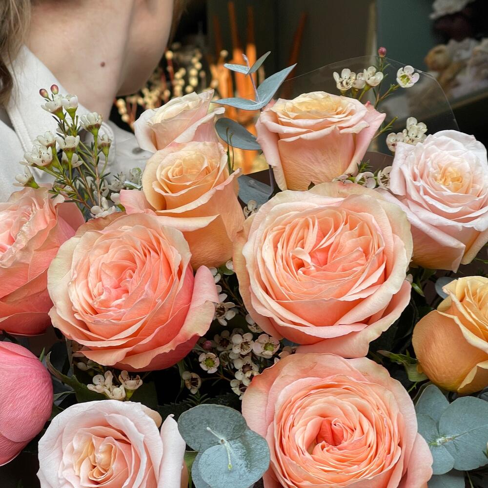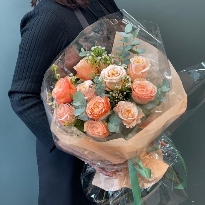 Ваксфлауэр – 2 шт.Лента – 1 шт.Эвкалипт – 2 шт.Роза одноголовая – 11 шт.Упаковка дизайнерская – 1 шт.